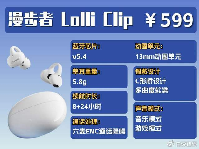 讲真,漫步者 Lolli Clip 居然有空间音频 + 头部追踪,这个我是挺意外的!打开后声音不挤耳,声场开阔,听歌追剧沉浸感还不错。音质方面,13 毫米钛金属振膜动圈,细节挺清晰,高低音也舒服,日常用完全够了。