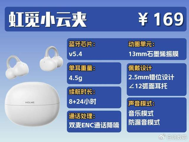 虹觅这款耳夹式耳机在百元价位里,各项性能都算不错。它有自研的防漏音模式,按一下就能减少声音外漏,不用再担心开放式耳机漏音的问题。核心配置上,用了蓝牙 5.4 芯片,连接比较稳定;还有HBC 智慧双联功能,一副耳机能拆成两副用,可以分别连接不同的设备,分享起来方便,双麦克风 ENC 降噪也能让通话很清楚。续航和防护方面也不用太担心,耳机8+24 小时的综合续航能满足好几天的使用,防水上IPX5 级防水应对日常泼溅没问题。