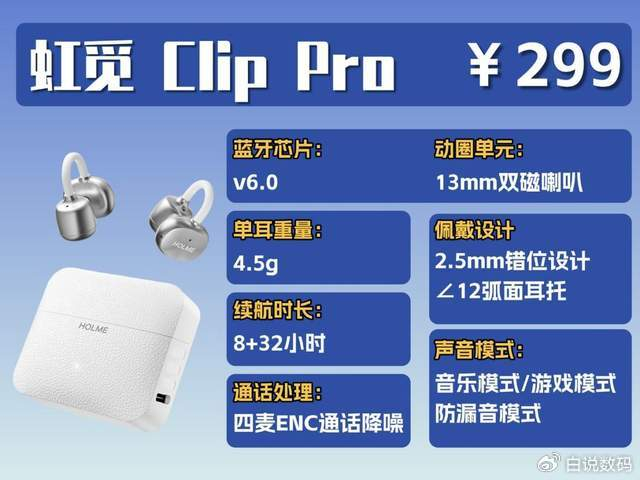 虹觅 HOLME Clip Pro 有自研的防漏音模式,打开后,基本不会有漏音,就算在比较安静的图书馆里也不会吵别人。耳机用的是最新的蓝牙 6.0 芯片,连接非常稳定,不容易断连。这款耳机还装了四个麦克风,打电话时声音很清晰。还支持智能一拖二功能,能同时连接两个设备。防水等级是IPX5,运动出大汗、下雨天溅到水都没事;还有游戏模式,玩手游时听声辨位更准确。续航也很给力,单耳能用 8 小时,加上充电仓总共能到 32 小时,这个配置性价比很高。