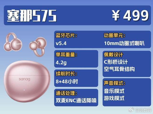 耳机的性能配置还是可以的,耳机用的是蓝牙 5.4还升级了塞那全新的7.0 蓝牙闪连技术,连接又快又稳,体验超棒;打电话也不用担心,还有双降噪技术,打电话的时候环境音都被过滤得差不多,声音特别清晰。防水等级是IPX4,运动出大汗、突然下小雨,也不怕耳机进水坏了;续航也超省心,单耳满电就能用 8 小时,再加上充电仓,总共能撑 48 小时。