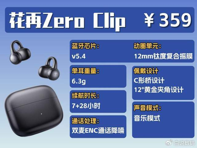 这款耳机的耳夹式设计可以让耳朵保持通透的感觉。耳机单耳约 6.3 克,戴在耳朵上感觉很轻,戴着很舒服。耳机的“C 型” 内桥外部用了高品质 TPU 材质,摸起来柔软亲肤;再加上12° 黄金夹角设计,既能牢牢贴合耳部,还能带来不错的佩戴体验。