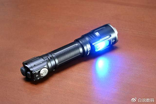 先来看下侧灯,仔细观察会发现在颈部一侧集成了白光、UV、红/蓝光多颗灯珠,无论是照明、警示、提醒、刑侦、鉴定等不同使用场景皆能发挥重要作用。白光的最高亮度可以达到150流明,而红、蓝光则为15流明。UV紫光则是900mW大功率365nm高能波长,其照射面积更大,效果也更明显。