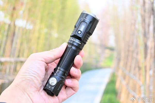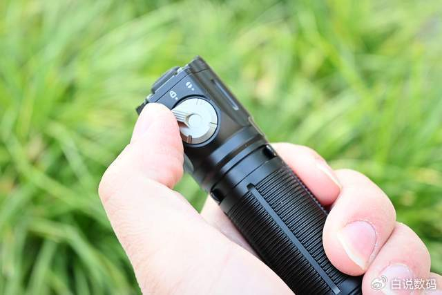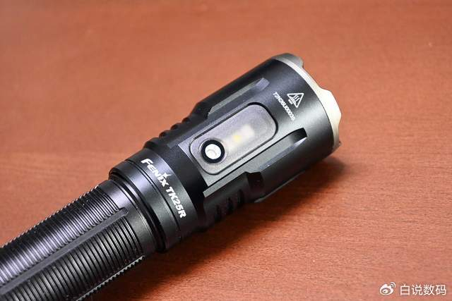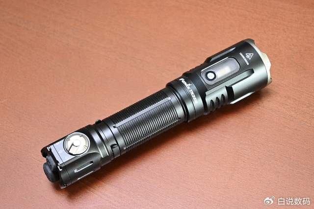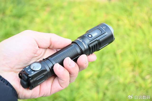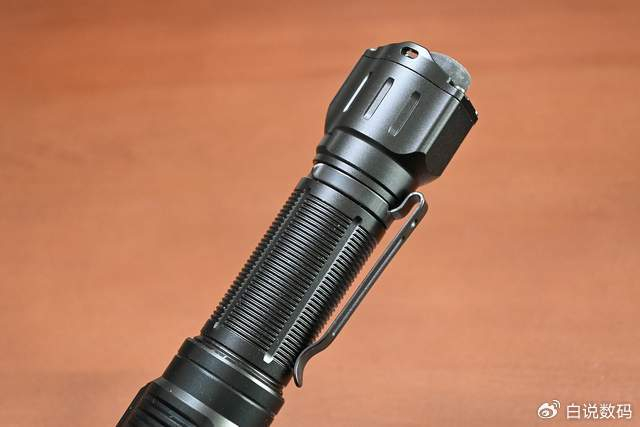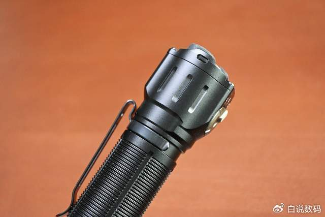 因为首尾分别加入了侧灯和拨盘的缘故,所以TK25R相较一般战术手电要显得更为修长些。不过其尺寸控制的还好,仍然属于便于携带的EDC日用筒范围。筒身黑色并不“油腻”,做工也很扎实,尽显一线大厂的实力。筒头处为了利于及时散热专门在两侧做了多道散热鳍,实际效果还不错,长时间的高亮下仍能做到不烫手。
