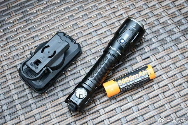 来张“全家福”:随机标配了一颗容量为5000毫安的原厂21700锂电池。在满电状态下续航最久可达55个小时,在极亮档下也能坚持2小时20分钟。当然我们也可以另购它家更大容量(6000毫安)的锂电池来提供续航或以作备用。