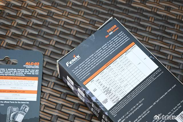 盒身背部则印有更为详尽的规参一览表,TK25R有勤务、战辅两种模式。前者有四个常亮档和一个爆闪档;后者有白光(分高、低档)、红光/红闪/红蓝和UV档,光源更丰富,应用场景也更为广泛。