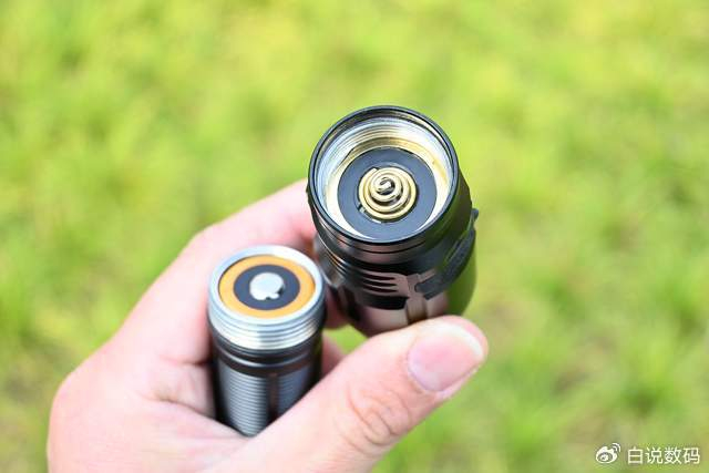 手电正负极均有厚实的镀金弹簧,这种双弹簧设计是战术手电的标配,它可以保证在剧烈震动下使用不会出现跳档、断电的情况,更为稳定。