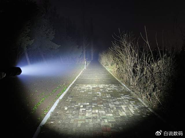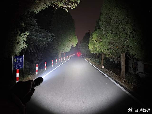 最后再来看下主灯:主灯白光共有四个常亮档位,其亮度分别为3600(极亮)/1000(高亮)/350(中亮)/30(低亮) LM。各档亮度的分配也很合理。日常使用开启中、高亮就能够满足大部分场景的照明所需了。实测手电在各档位下均无频闪现象。在极亮档位下,手电的射程可达350米之远,它的主副光斑分界明显,主光斑亮而小,副光斑大而广。可以很好的兼顾远射与铺路。