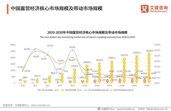 iiMedia Research(艾媒咨询)发布的《2025-2030年中国露营经济发展前景与商业布局分析报告》数据显示,中国露营经济核心市场规模和带动市场规模均呈现逐年上升的趋势。2024年中国露营经济核心市场规模达到2139.7亿元,同比增长60.4%;带动市场规模为11554.5亿元,同比增长46.8%;预计2030年中国露营经济核心市场规模将上升至4879.8亿元,带动市场规模将达到23998.5亿元。随着消费升级,越来越多的消费者加入露营的活动中,露营及其相关产业在中国有着较大的发展空间。