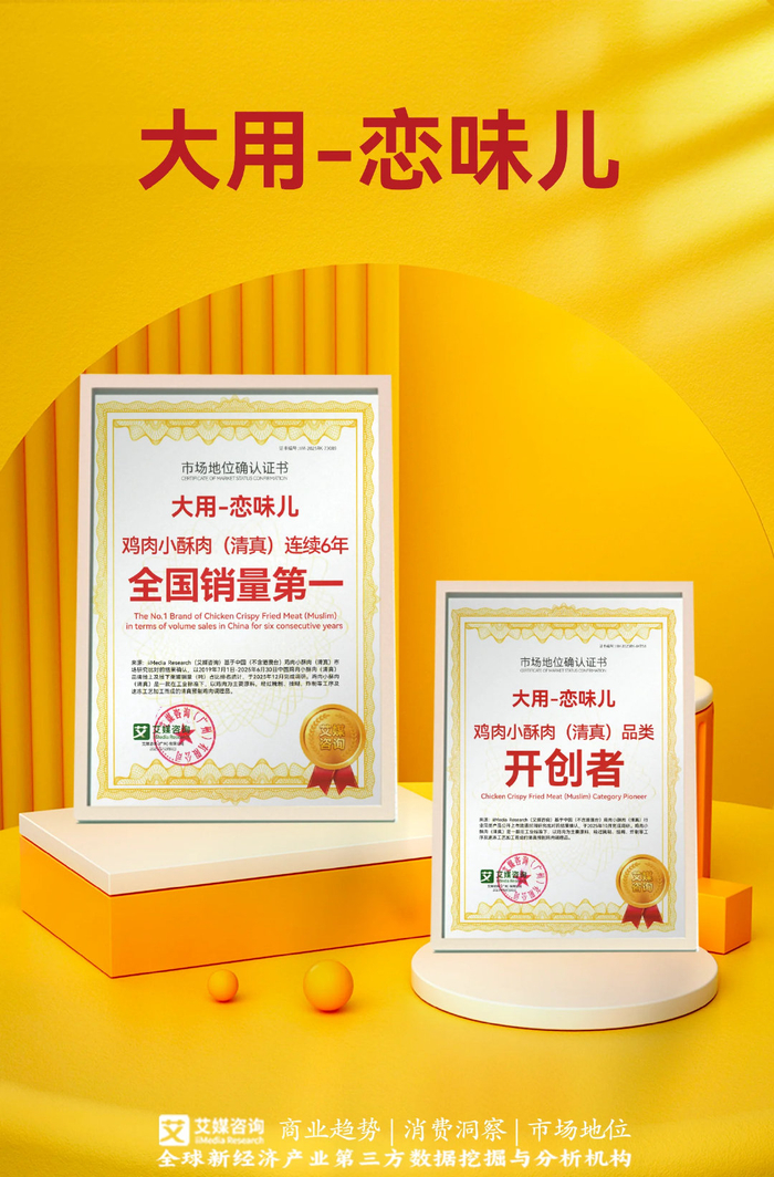 近期,恋味儿获全球领先的新经济产业第三方数据挖掘和分析机构iiMedia Research(艾媒咨询)授予的“鸡肉小酥肉(清真)连续6年全国销量第一”“鸡肉小酥肉(清真)开创者”双项市场地位确认。