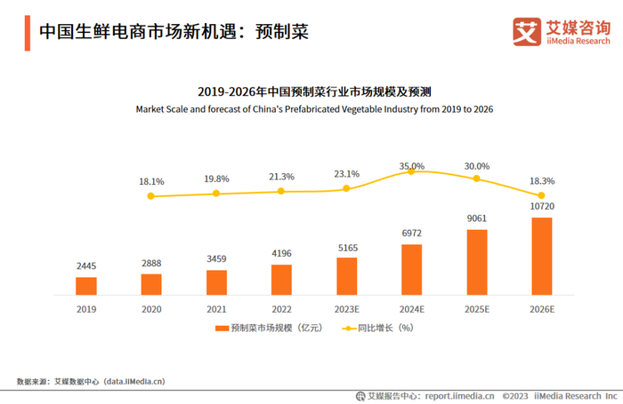 iiMedia Research(艾媒咨询)数据显示,2022年中国预制菜行业规模为4196亿元,同比增长21.3%,预计未来中国预制菜市场保持较高的增长速度,2026年预制菜行业市场规模将达10720亿元。近年来,预制菜行业受到市场的青睐,生鲜电商预制菜在春节、中秋节等节假日订单量增长,成为行业发展新机遇,吸引了美团买菜、饿了么、盒马、叮咚买菜等生鲜电商平台入局。