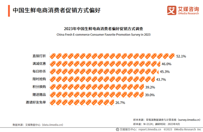 iiMedia Research(艾媒咨询)数据显示,中国生鲜电商消费者偏好直接打折(52.1%)和满减优惠(46.0%)两种促销方式。艾媒咨询分析师认为,大部分用户会对比产品性价比、促销活动等因素后再选择平台进行消费,生鲜电商平台可针对性地设计创新型营销活动,迎合消费者需求。