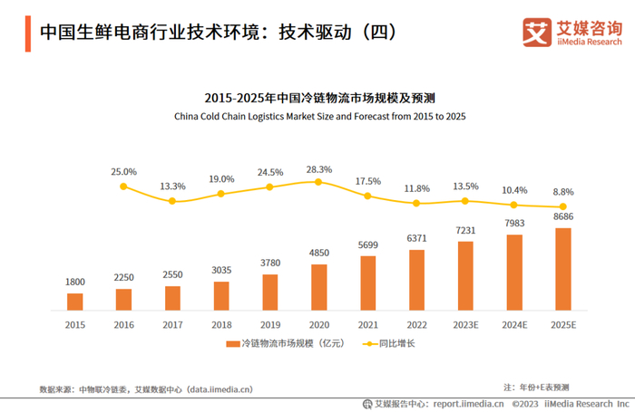 2022年中国冷链物流市场规模为6371亿元,同比增长11.8%;预计2025年将达到8686亿元。生鲜电商行业参与者正逐步加码投资冷链链条的两端,分别是靠近农产品主产区的产地仓,和靠近消费区的线下店/前置仓,希望解决生鲜电商“最先一公里”与“最后一公里”的需求痛点,提升商品品质和消费者体验。