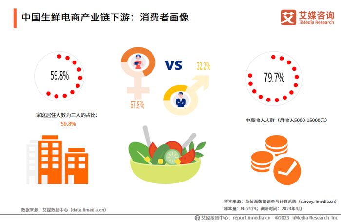 iiMedia Research(艾媒咨询)数据显示,中国生鲜电商消费者粘性较高,89.7%的人每周消费1-4次;81.7%的人单次消费金额集中于50-200元之间。中国消费者偏好的生鲜电商平台前三分别是美团买菜(47.1%)、多多买菜(40.2%)、盒马鲜生(31.0%)。
