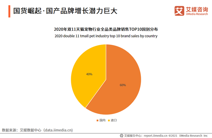 数据显示,2020年双十一期间,宠物行业全品类品牌销售前十名中,国产品牌占比达到了60%。国产品牌的产品质量逐渐增强,消费者对国产品牌的信赖日益增加。国产品牌以其亲民的价格更能得到消费者的青睐。线上销售的宠物产品中,以宠物食品、宠物洗护用品等有形的物品居多。