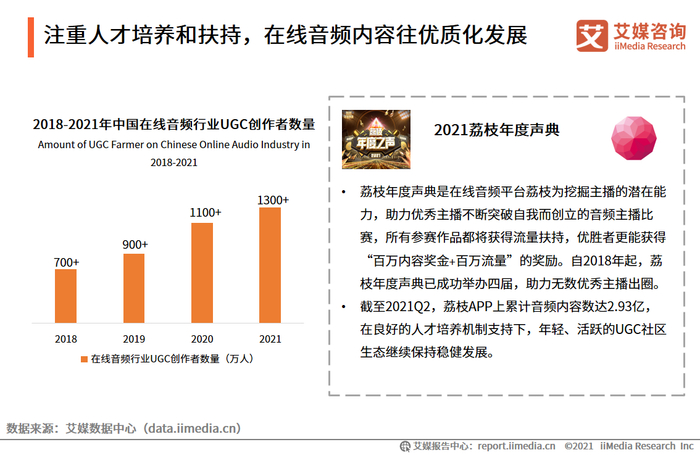 iiMedia Research(艾媒咨询)数据显示,中国在线音频行业UGC创作者数量呈现上升趋势,在线音频UGC内容创作者数量超1300万人。优质的平台内容是在线音频平台维持活力的关键因素,在线音频平台应加大对UGC创作者的扶持,刺激创作者创作高质量的音频内容。