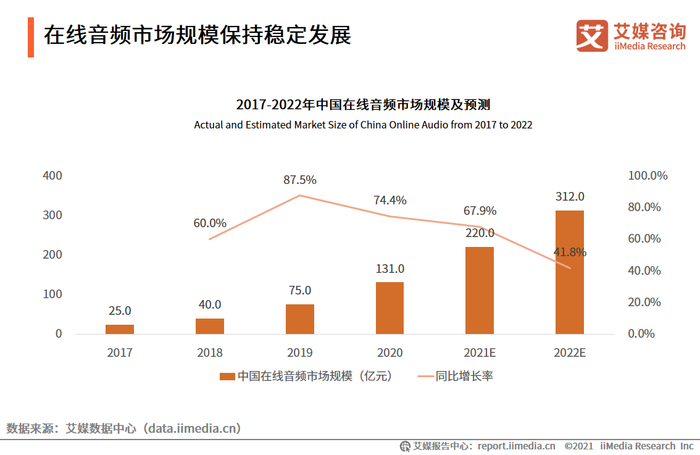 数据显示,中国在线音频市场规模呈现增长趋势,预计2022年在线音频市场规模将达312.0亿元,同比增长41.8%。随着在线音频内容的丰富,应用场景拓宽,这不仅扩大了在线音频的用户规模,同时也不断提升线音频平台的创收方式,实现双向发展。