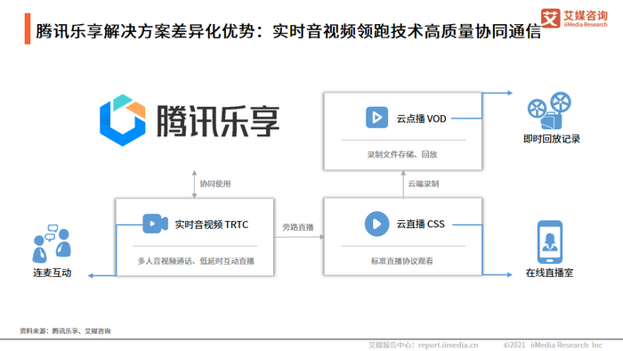 腾讯实时音视频TRTC技术主打全平台互通的多人音视频通话和低延时互动直播解决方案。通过腾讯云不同产品间的相互联动,能简单快速地将实时音视频 TRTC 与云直播 CSS、云点播 VOD 等云产品协同使用,扩展腾讯乐享协同通信版块的多元功能场景。腾讯乐享的在线直播室、连麦互动、即时回放记录等功能便是基于腾讯实时音视频 TRTC 等技术,打造企业培训过程中高质量低延时的优质协同通信体验。