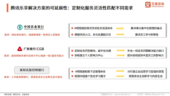 中国银行业的企业学习痛点存在普遍性:培训管理效率和员工参与积极性较低等两大主要痛点。基于不同银行的组织特点,培训需求展现出不同侧重点的差异化。腾讯乐享区别于其他数字化企业学习平台,具备较大的灵活性,能根据不同银行的需求,提供平台定制服务。