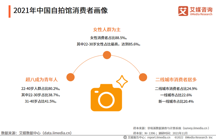 根据iiMedia Research(艾媒咨询)最近发布的《2021-2022年中国自拍馆市场发展报告》,中国自拍馆消费者女性居多,占比达88.5%,其中22-30岁的女性占比最高,达85.6%。从城市等级来看,一、二线城市消费者占比均超20%,其中二线城市用户比例略高一些。艾媒分析师认为,目前我国自拍馆行业用户以年轻女性为主,目标消费群体较为明确。