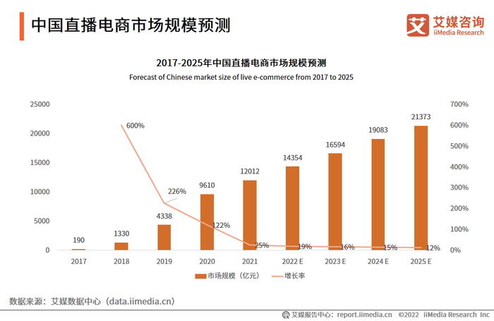 iiMedia Research(艾媒咨询)数据显示,2021年,中国直播电商行业的总规模达到12012亿元,预计到2025年规模将达到21373亿元。艾媒咨询分析师认为,随着互联网技术的发展,以直播为代表的KOL带货模式给消费者带来更直观、生动的购物体验,转化率高,营销效果好,逐渐成为电商平台、内容平台的新增长动力。