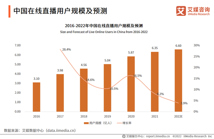 iiMedia Research(艾媒咨询)数据显示,到2022年中国在线直播用户规模将达到6.6亿人,涵盖了游戏直播、秀场直播、生活类直播、电商直播等,说明观看直播逐渐成为人们的上网习惯之一。艾媒咨询分析师认为,庞大的直播用户体量是直播电商行业进行商业变现的前提之一。
