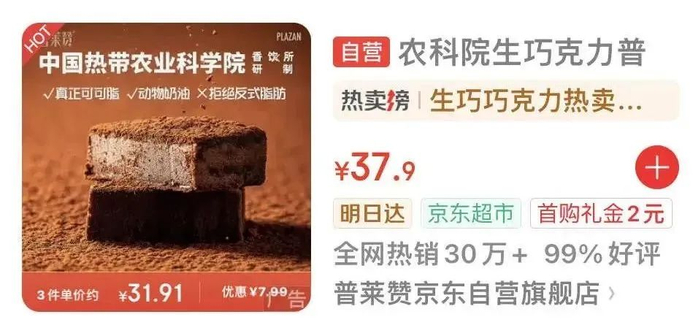 在京东电商,中国热带农业科学院的生巧克力热销30万;好利来生巧克力礼盒于2018年推出,至今仍在电商平台获得10万+评价,数年间好评不断。
