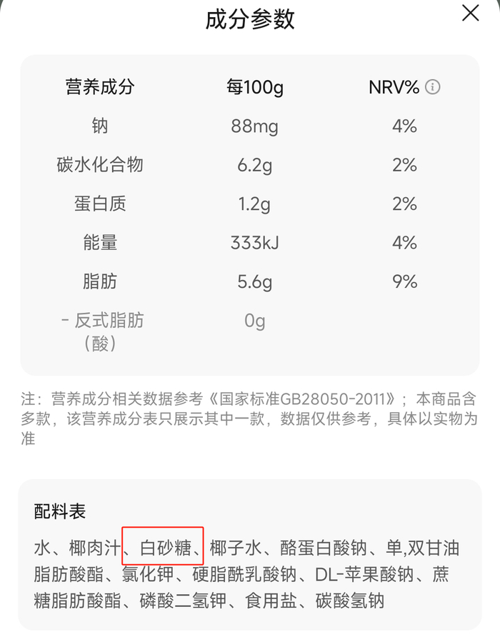 网上不少博主复刻生椰拿铁,用的就是厚椰乳加咖啡液,而根据京东上某销量100万+的厚椰乳配料表,厚椰乳里除了水、椰肉汁、椰子水等,还有白砂糖等多种配料。