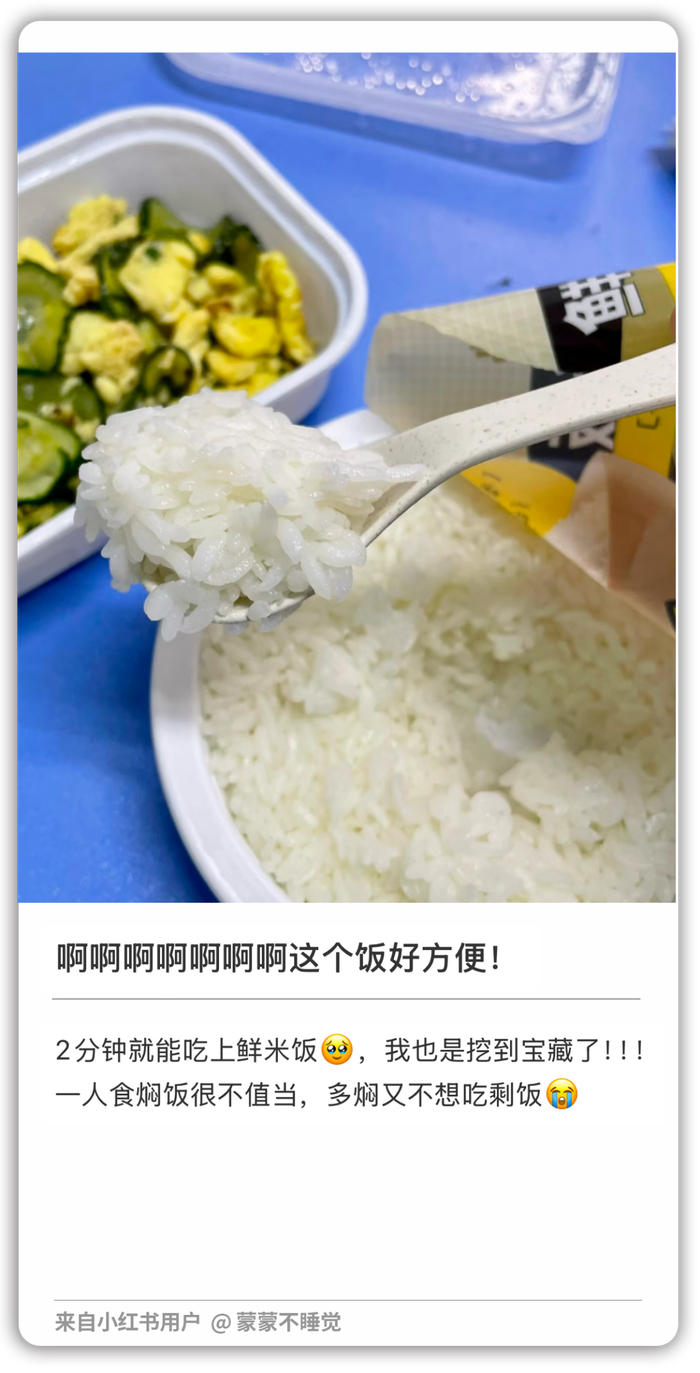 是,饭要吃新鲜的,但如今职场工作者的生活节奏,不是心想,就能事成的——它极大程度上由今天是否加班,领导是否突发奇想,同事是否临时组局,今天是否想减肥,疯狂星期四到没到控制着。常温保存的预制米饭,至少能随意放在卧室/阁楼这些空间里。面对突发的做饭热情,也不需要担心电饭煲的开关有没有开。
