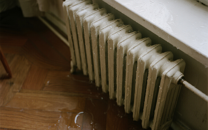 当冷气片中流着冷冰冰的水时,它的表面温度会非常低,导致水蒸气会在冷气片表面凝结成水珠,就像夏天从冰箱里拿出的冰镇饮料瓶一样“出汗”。