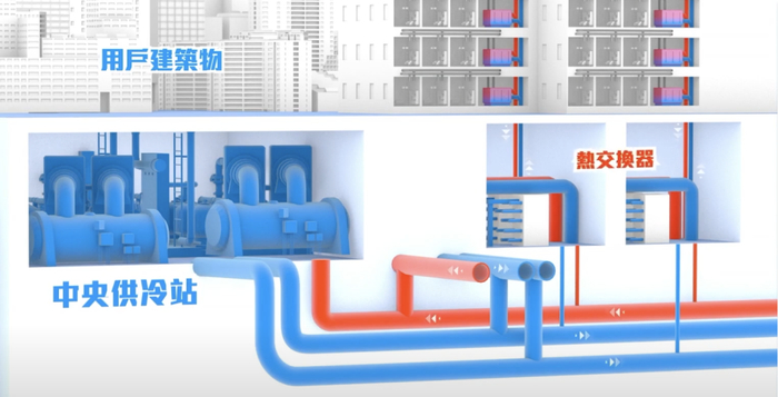 供冷项目配建区域制冷站,制造低温冷水;这些低温冷水流进用户楼宇,通过换热站制备二次冷水,二次冷水再流进“冷气片”。