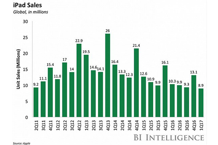 自2013年开始,iPad已经出现了14季度销量环比下滑,而非单纯因销售淡旺季而产生的销量波动。而2017年第一季度,iPad销量890万台,同比2014年Q1的1640万台销量,iPad销量近乎腰折,断崖式的下跌足以说明iPad面临着严峻的形式。