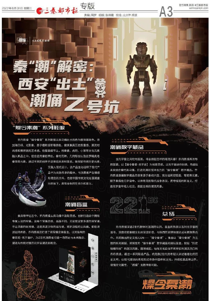 秦朝的建立,实现了中国历史上首次统一,这也使得秦朝在我国文化历史上具有重要意义。而秦朝IP自带的流量,也激发了无数影视剧、综艺以及手游的衍生。同时,乔丹质燥洞察到以Z世代为主的年轻消费者对元宇宙和潮玩手办的兴趣,所以从秦朝IP中汲取灵感,联合陕西历史博物馆推出国潮icon——燥令秦潮,推出了以「燥令秦潮」为主题的系列鞋服、手办和数字藏品,上演了一场秦朝·元宇宙的时空穿梭之旅,进一步塑造了品牌时尚潮流、运动年轻化印象,强化乔丹质燥的国潮基因。