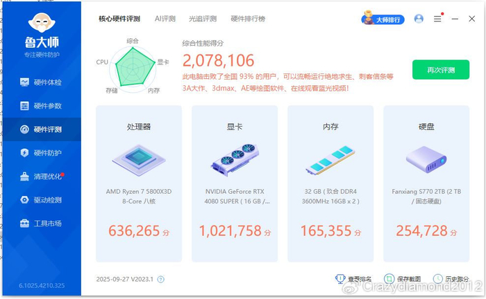 鲁大师评测总分是2078106,CPU得分636265,显卡1021758,内存165355,硬盘254728。鲁大师就内存有明显提升,其他反而略有降低。