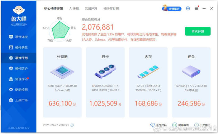 鲁大师评测总分是2076881,CPU得分636100,显卡1025509,内存168686,硬盘246586。除了内存有些提升,其他反而有些下降。