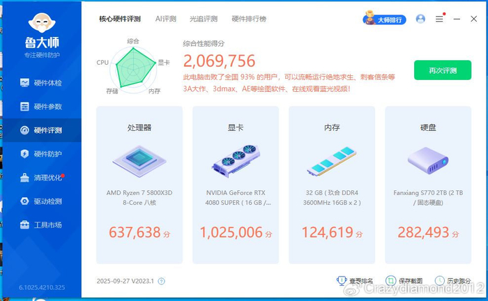 鲁大师评测总分是2069756,CPU得分637638,显卡1025006,内存124619,硬盘282493。