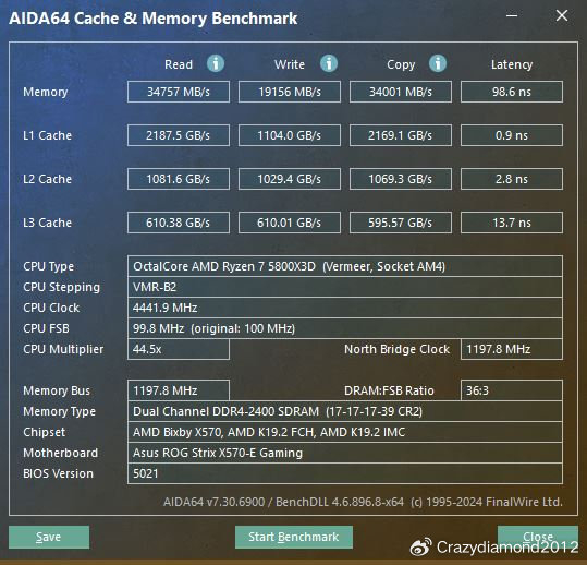 在2400MHz的频率下,我进行了一系列的测试,首先是AIDA64的缓存与内存测试,内存读取速度是34757MB/s,写入19156MB/s,复制是34001MB/s,延迟98.6ns。