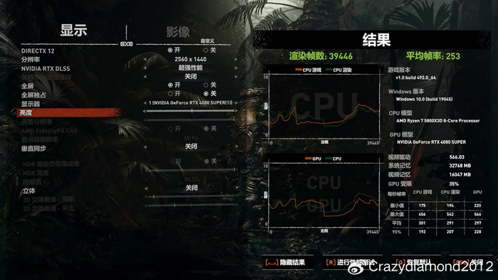 《古墓丽影:暗影》,2K分辨率,画质设置最高,结果是渲染帧数39446,平均帧率253。测试结果也是略有提升。