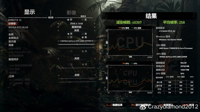 《古墓丽影:暗影》,2K分辨率,画质设置最高,结果是渲染帧数40307,平均帧率258。略微提升