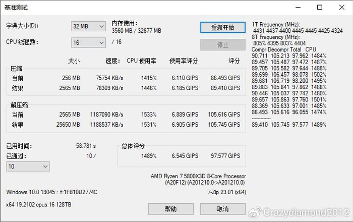 7Z的基准测试,10轮下来,总体评分是97.577GIPS,略微下降