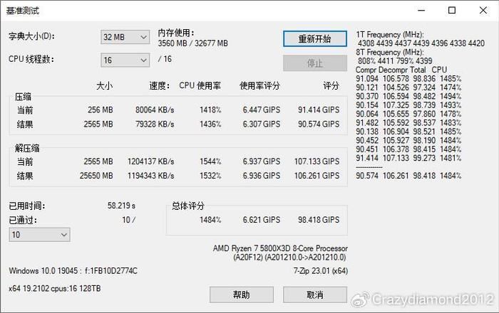 7Z的基准测试,10轮下来,总体评分是98.418GIPS,同样提升明显