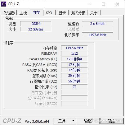 然后开CPU-Z看了下,由于没有开启XMP,目前内存频率运行在2400MHz,此时时序是CL17-17-17-39,电压是1.2V。