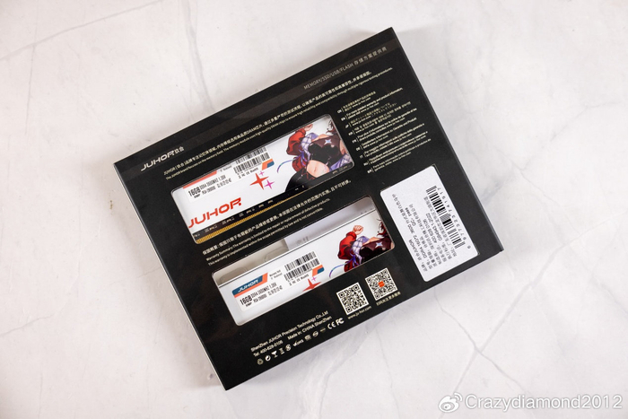 玖合星舞DDR4 3600 16GB x2套装的包装盒也是二次元的风格,中间是产品的渲染图,包装盒的背面开有透明天窗,可以直接看到内存上的标签,上面有容量、频率、电压、时序等参数内容。