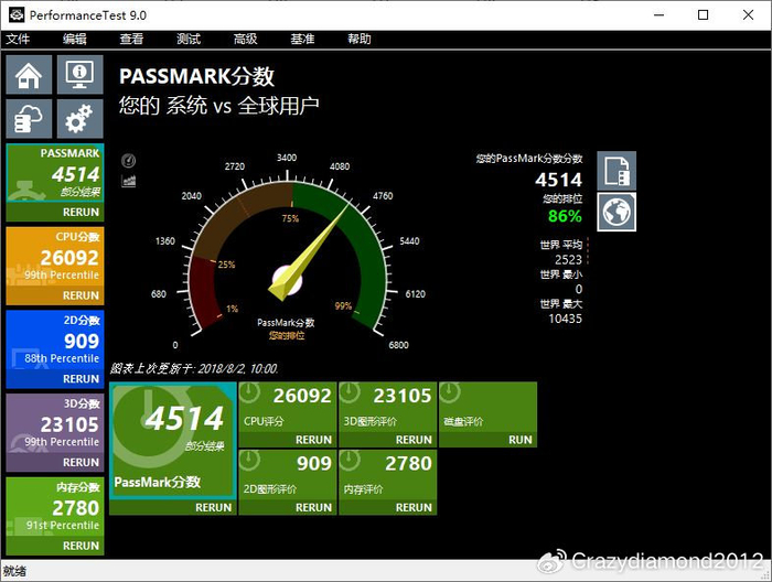 在PerformanceTest 9.0的测试中,总得分是4514,CPU评分26092,3D图形评分23105,2D图形评分909,内存评分2780。整体的测试结果也都有明显提升。