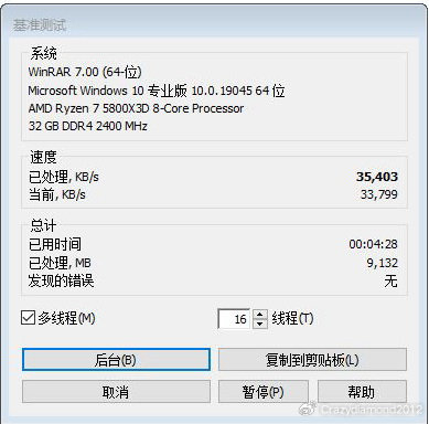 跑了Winrar的基准测试,测试成绩是33799KB/s。