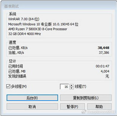 Winrar的基准测试,测试成绩是37386KB/s,略微提升