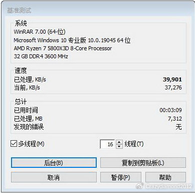 Winrar的基准测试,测试成绩是37276KB/s。提升还是比较明显的。