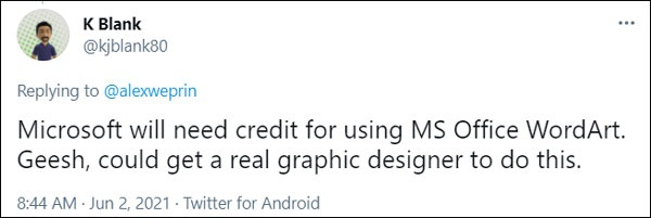 “他们得谢谢微软,毕竟用了人家MS Office艺术字。天啊,就不能找一个真正的平面设计师设计下吗。”