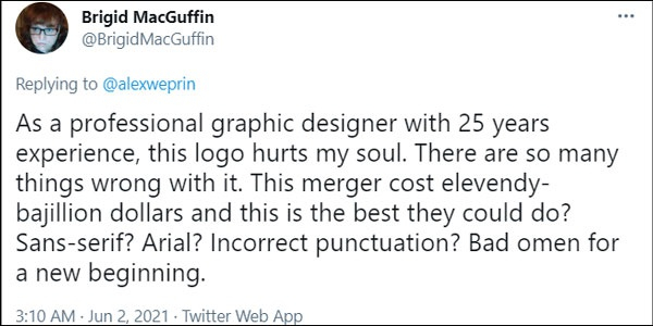 “作为一个有着25年经验的专业平面设计师,这个logo深深地伤害了我。问题也太多了。这次合并要花那么多亿美元,而这就是他们能做的最好的了?无衬线字体?Arial?标点错误?对新的开始来说,这是一个不祥预兆。”