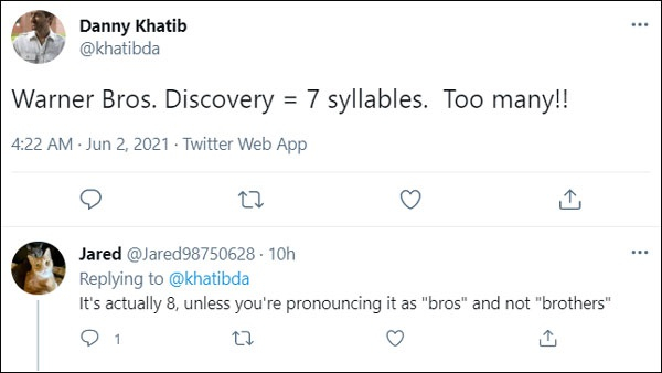 "华纳兄弟探索,7个音节,太多了吧!!”“实际上有8个哟,除非你只念bros,而不是全称brothers.”