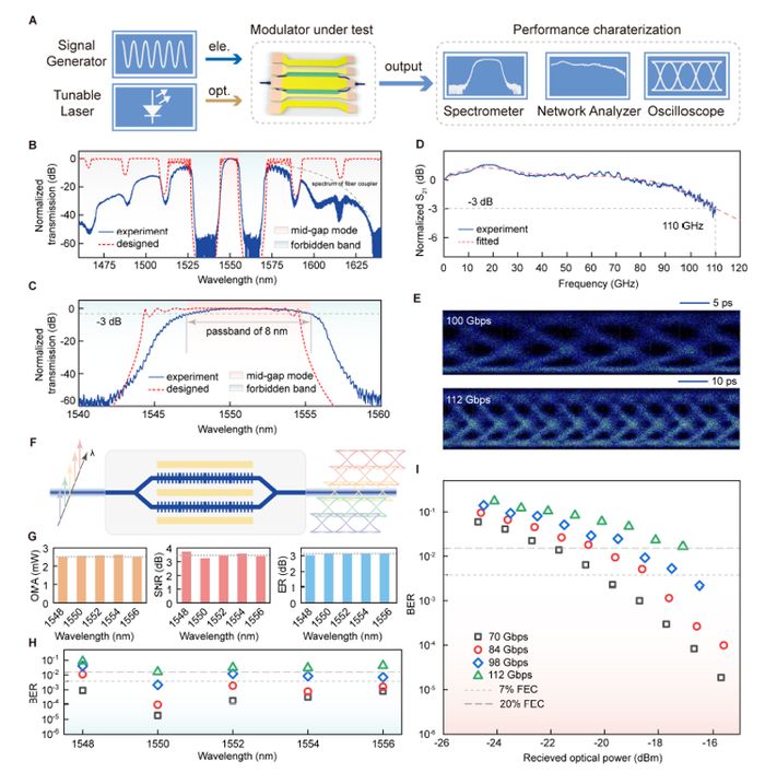 基于慢光效应的硅基调制结构。图自北京大学电子学院网站在本次工作中,研究团队针对传统硅基调制器带宽受限问题,利用硅基耦合谐振腔光波导结构引入慢光效应,构建了完整的硅基慢光调制器理论模型,通过合理调控结构参数以综合平衡光学与电学指标因素,实现对调制器性能的深度优化。研究团队基于CMOS集成工艺兼容的硅基光电子标准工艺,在纯硅材料体系下设计并制备了在1550纳米左右通信波长下工作的超高带宽硅基慢光调制器,实现了110GHz的超高电光带宽,打破了迄今为止纯硅调制器的带宽上限,并同时将调制臂尺寸缩短至百微米数量级,在无须数字信号处理的情况下以简单的二进制振幅键控调制格式实现了单通道超过110Gbps的高速信号传输,降低了算法成本与信号延迟,同时在宽达8纳米的超大光学通带内保持多波长通信性能的高度均一性。